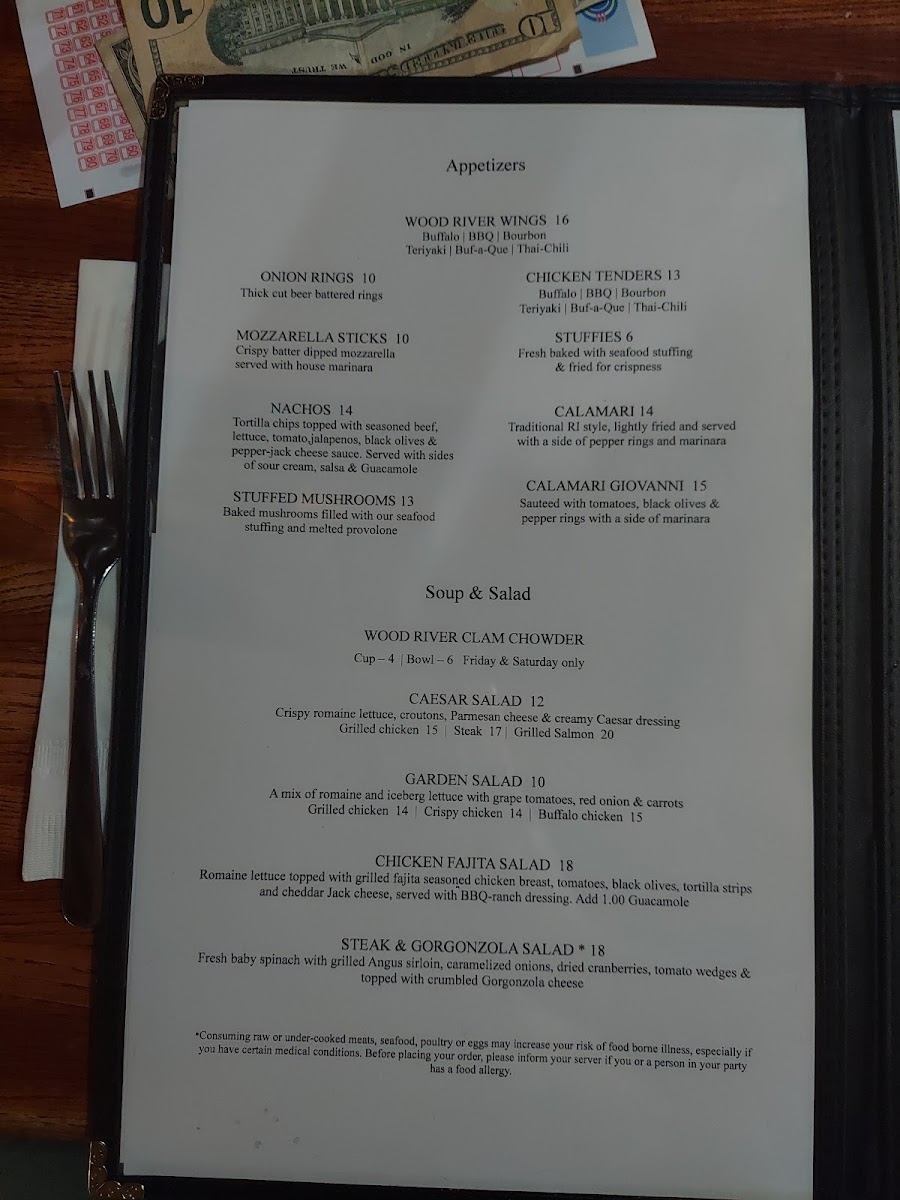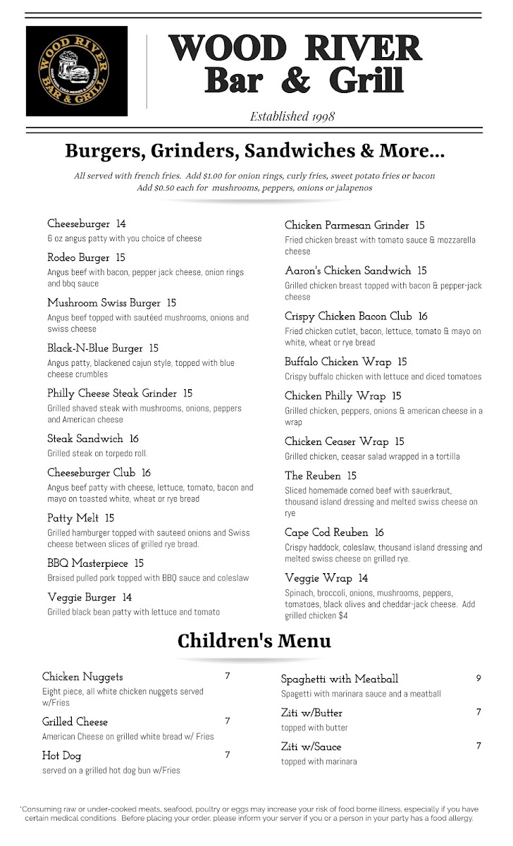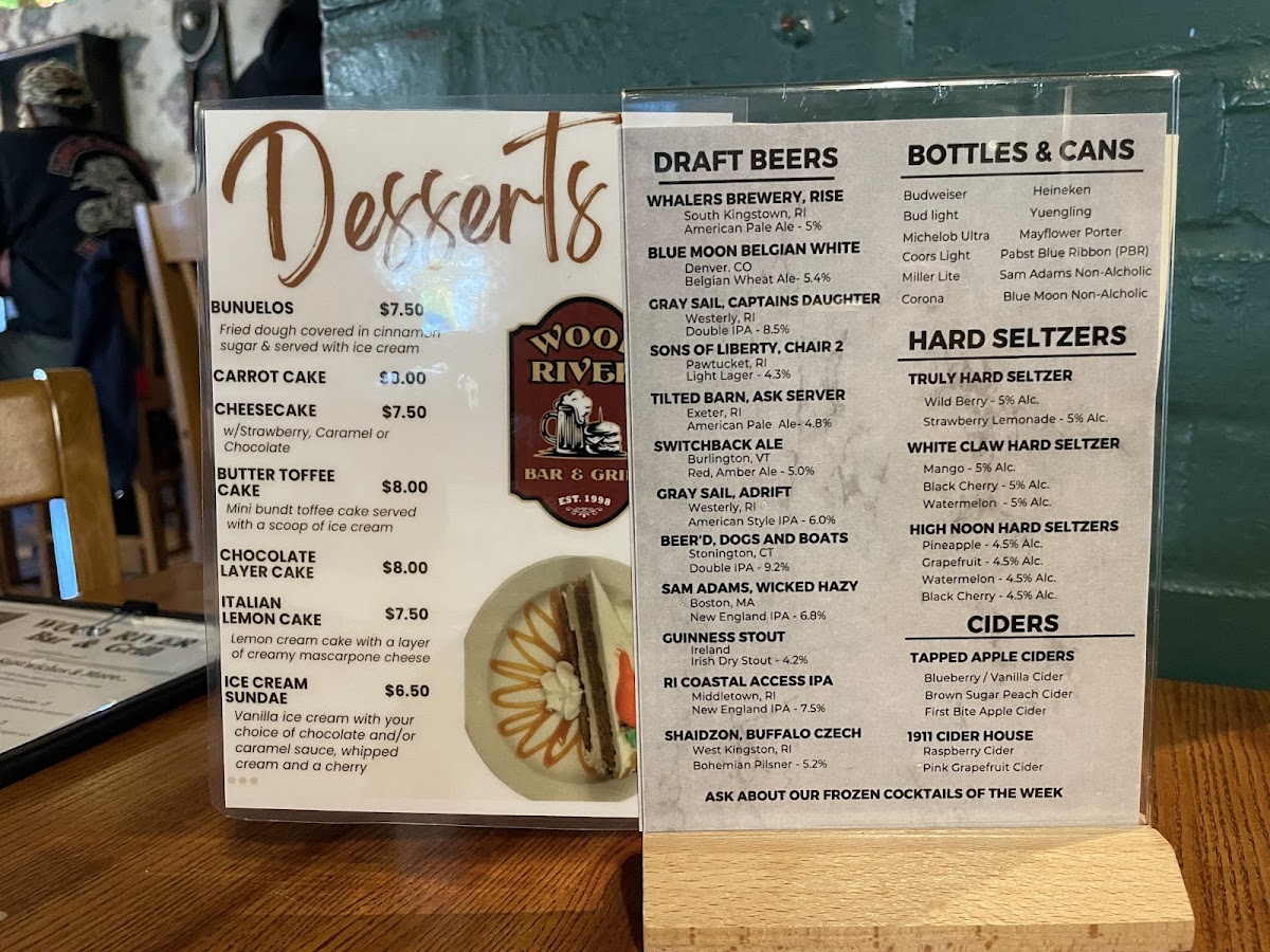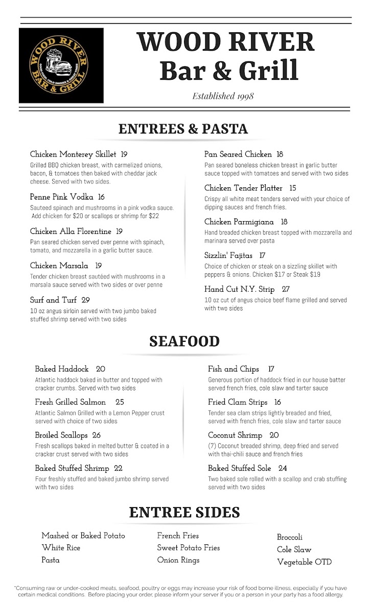 The Wood River Bar & Grill Menu offers a delicious variety of comfort food that will make you feel right at home. Located at 1139 Main St in Wyoming, RI, this local favorite has been serving up hearty meals for everyone, whether you're looking for a quick bite or a full meal to enjoy with friends and family. With a range of mouthwatering appetizers, juicy burgers, fresh salads, and satisfying entrees, there's something for every craving.